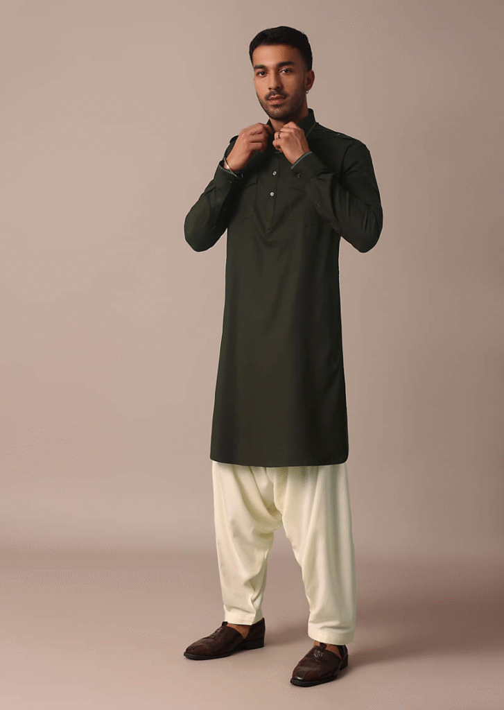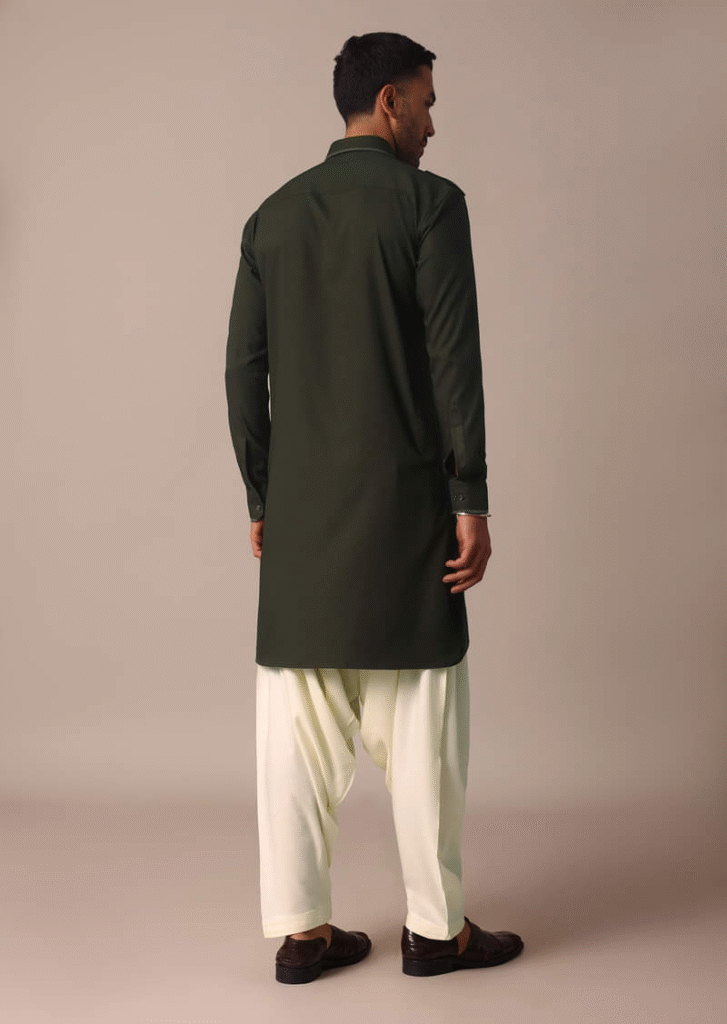 Make a refined statement with our Men’s Green & White Contrasted Shalwar Kameez, designed for the man who values sophistication with subtle contrast. The rich emerald green kameez paired with a crisp white shalwar creates a sharp, elegant look that stands out effortlessly in any gathering.